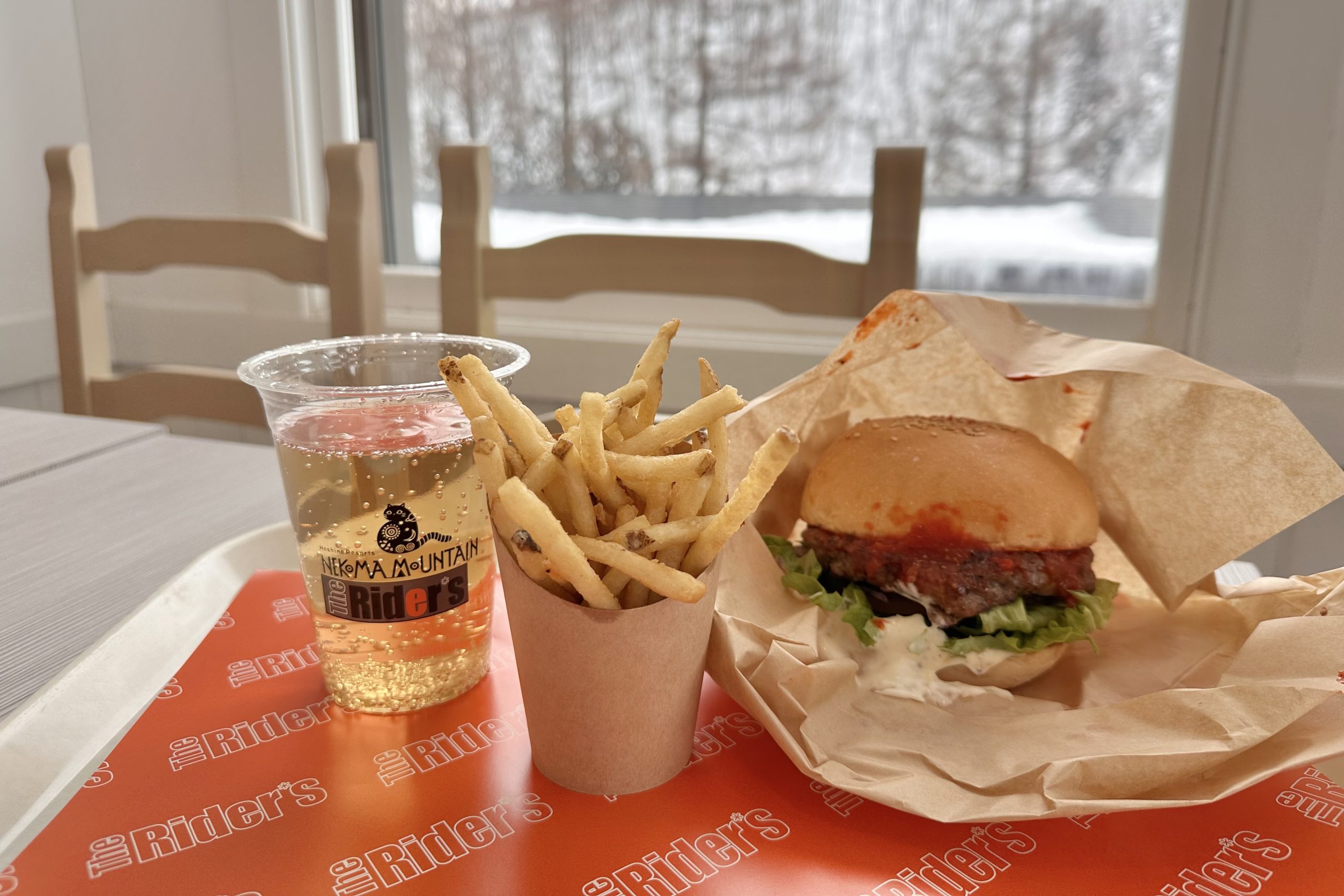 ゲレンデ中腹にあり、滑らないと行けない「The Rider’s」。初心者には少し難易度の高い場所ですが、それでも行く価値のあるハンバーガーが味わえます。