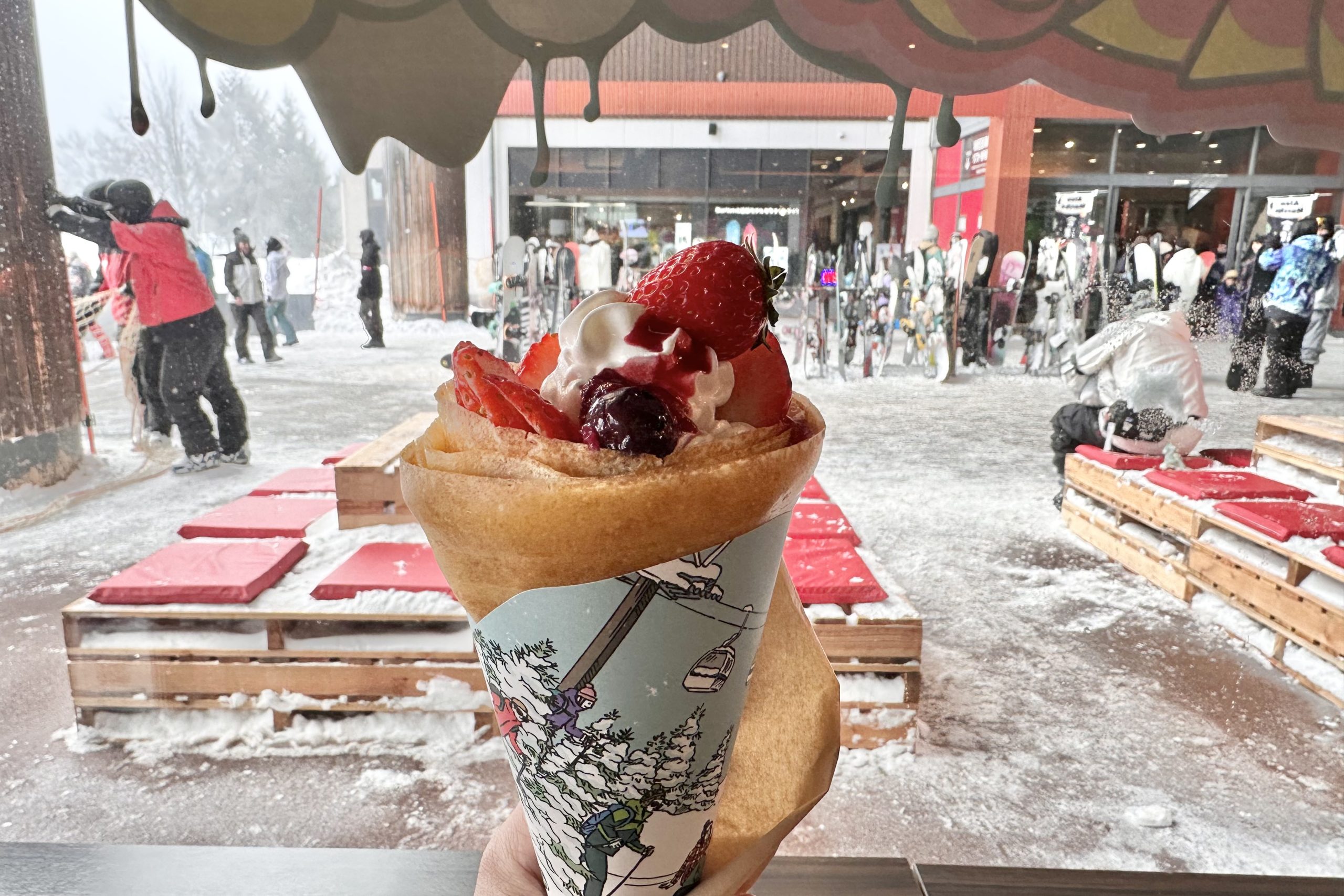 スキーの合間の休憩には、リゾートセンター内にあるカフェ「yamacafe」がおすすめ。焼きたての美味しいクレープとドリンクが楽しめます。