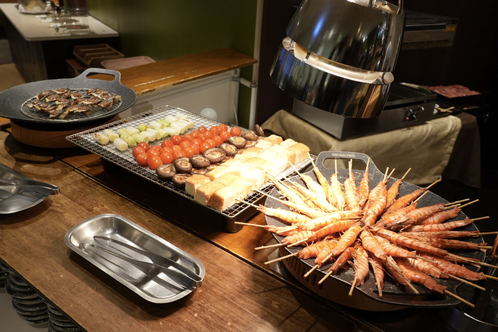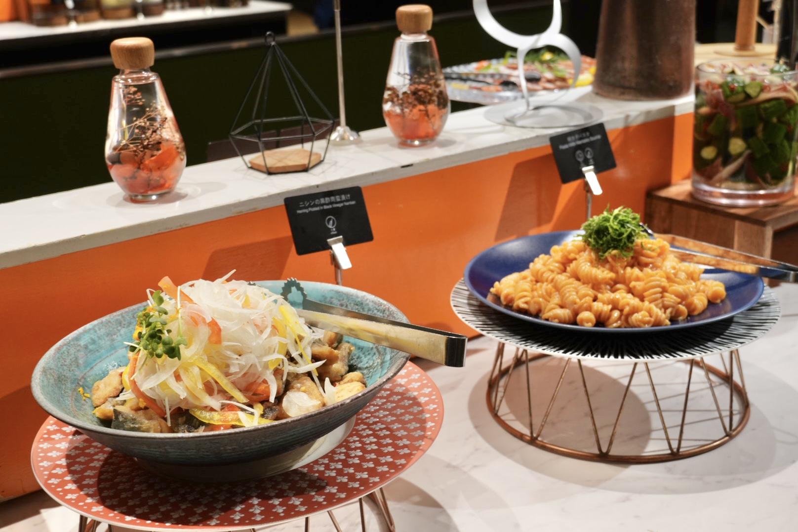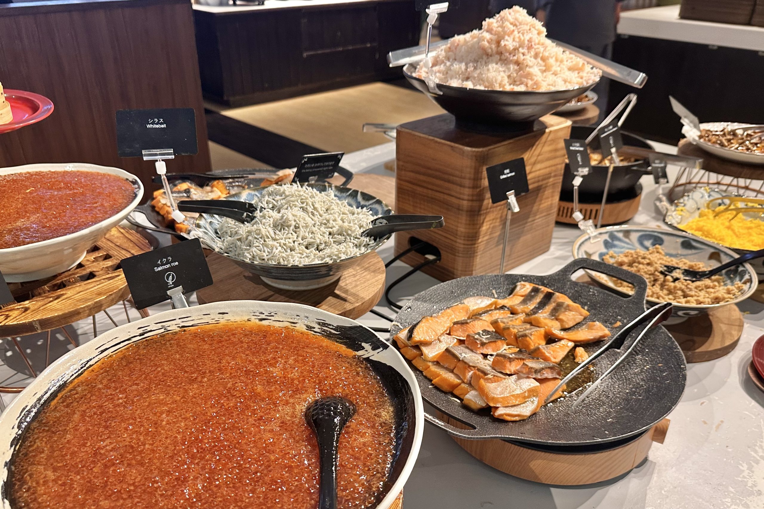 ライブキッチンでは出来立ての料理が提供されます。天ぷらや炉端焼きは日替わりで登場し、連泊でも飽きません。
