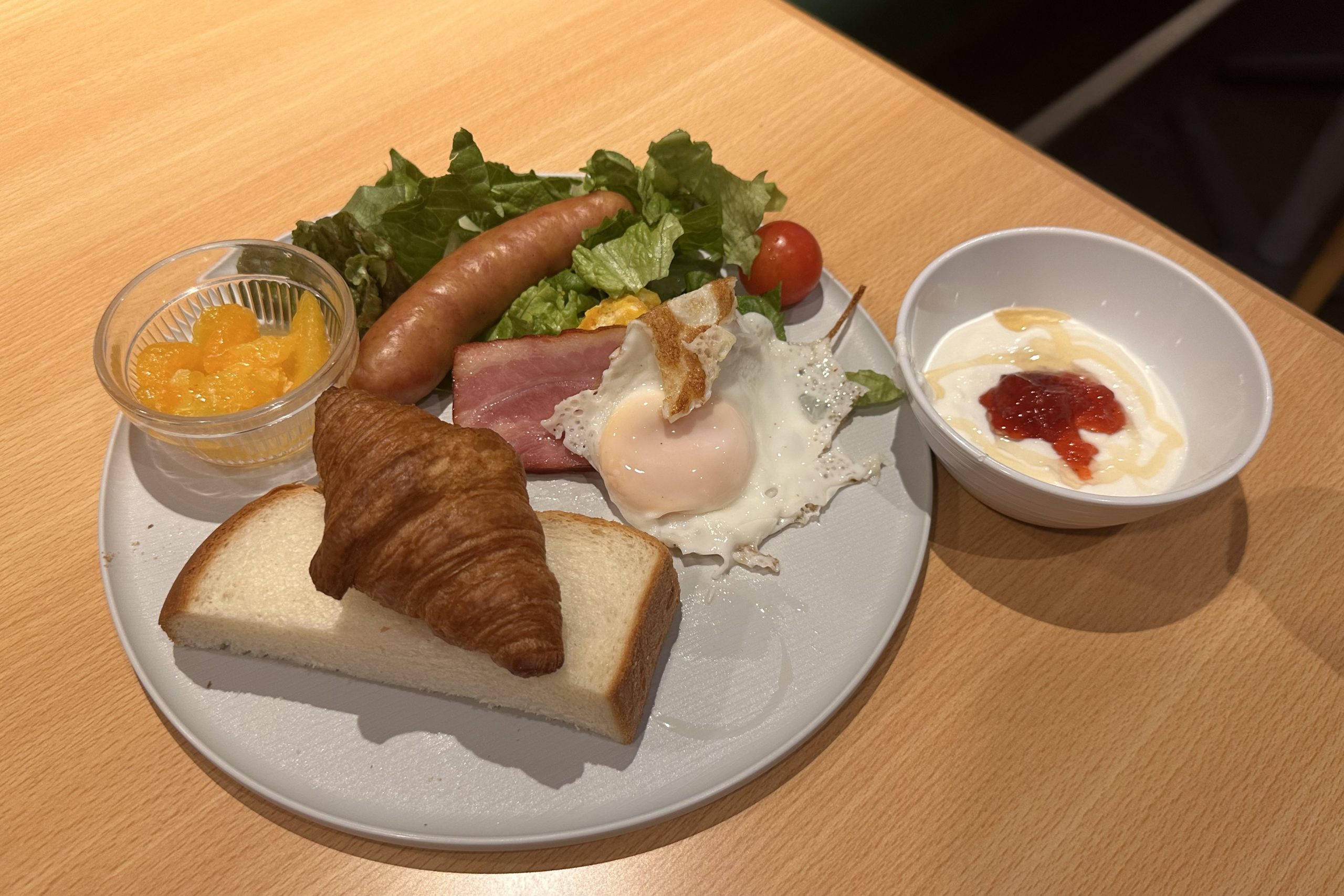 もう1種類の洋食はソーセージやベーコン、サラダを盛り込んだアメリカンスタイル。焼きたてパンなどボリュームもたっぷりです。