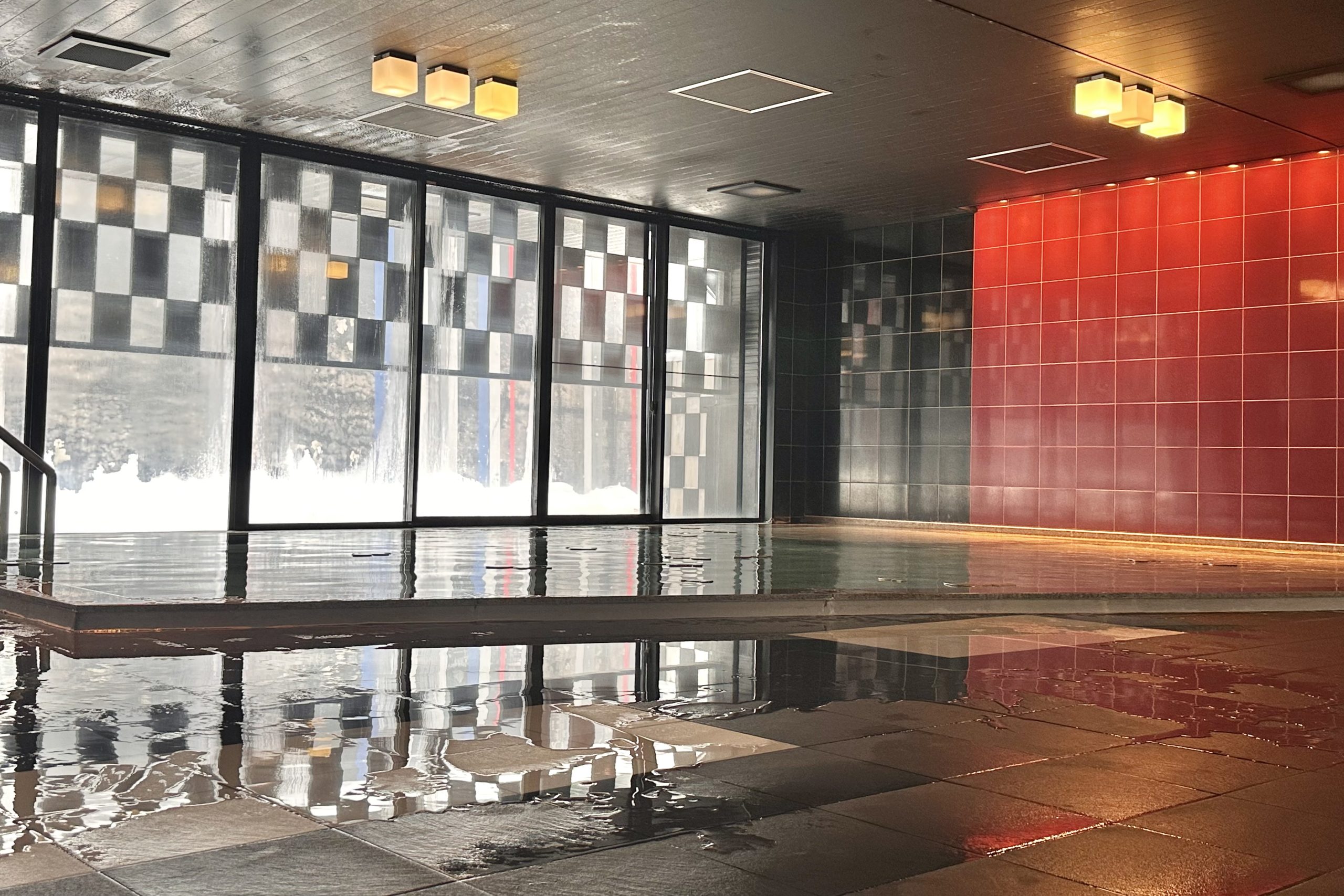 「磐梯山温泉ホテル」の大浴場「朱嶺の湯」は、会津漆器をイメージしたモダンなデザインの浴室。