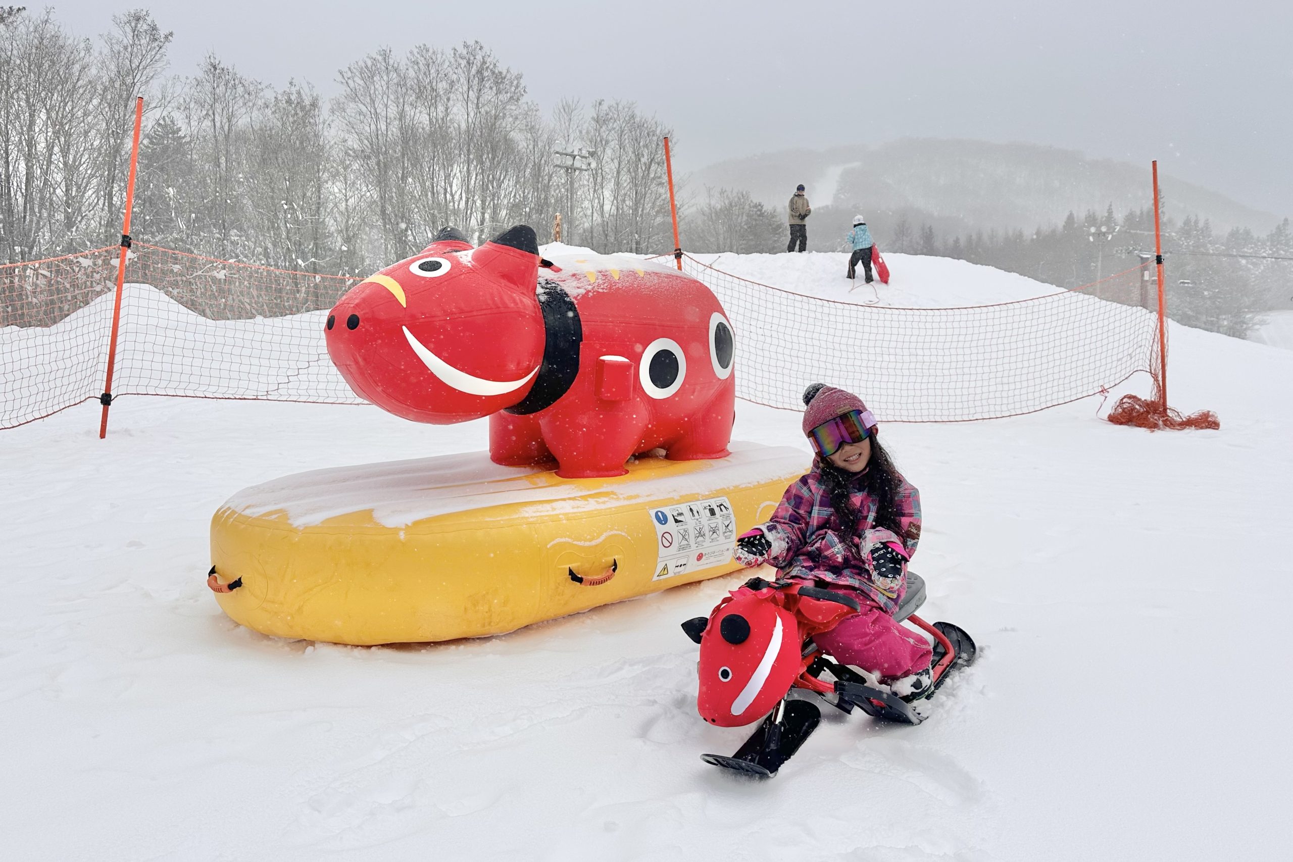 雪遊び広場「でっこら赤べこ雪広場」は、小さな子の雪遊びデビューにも最適。そりや雪遊び道具も自由に借りられます。
