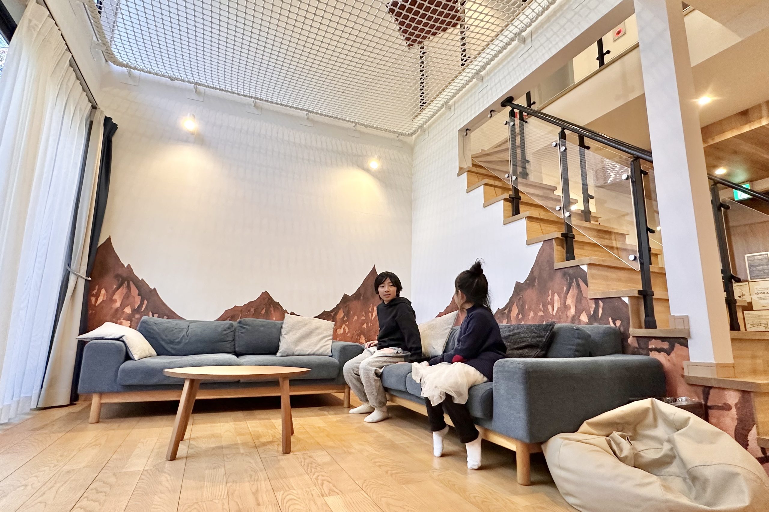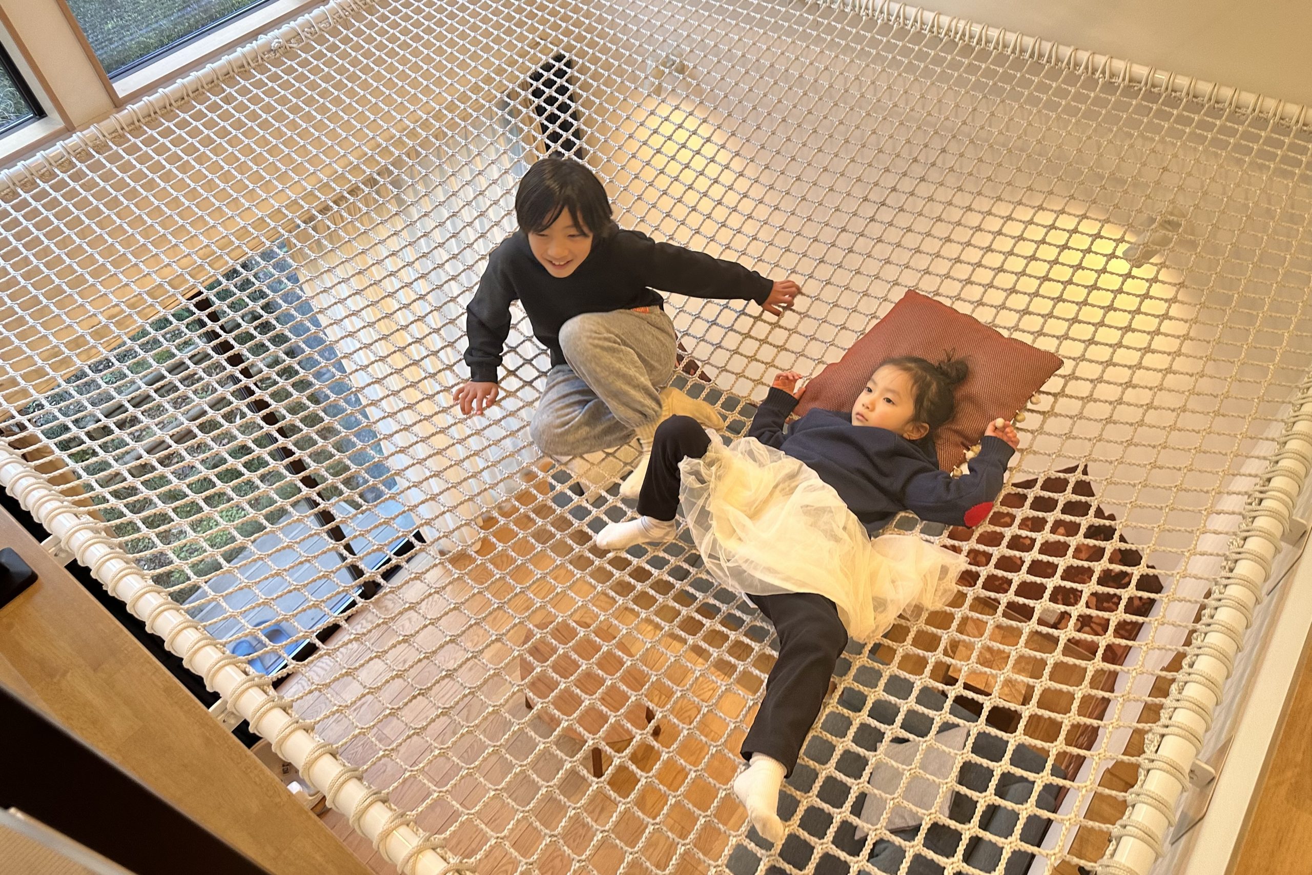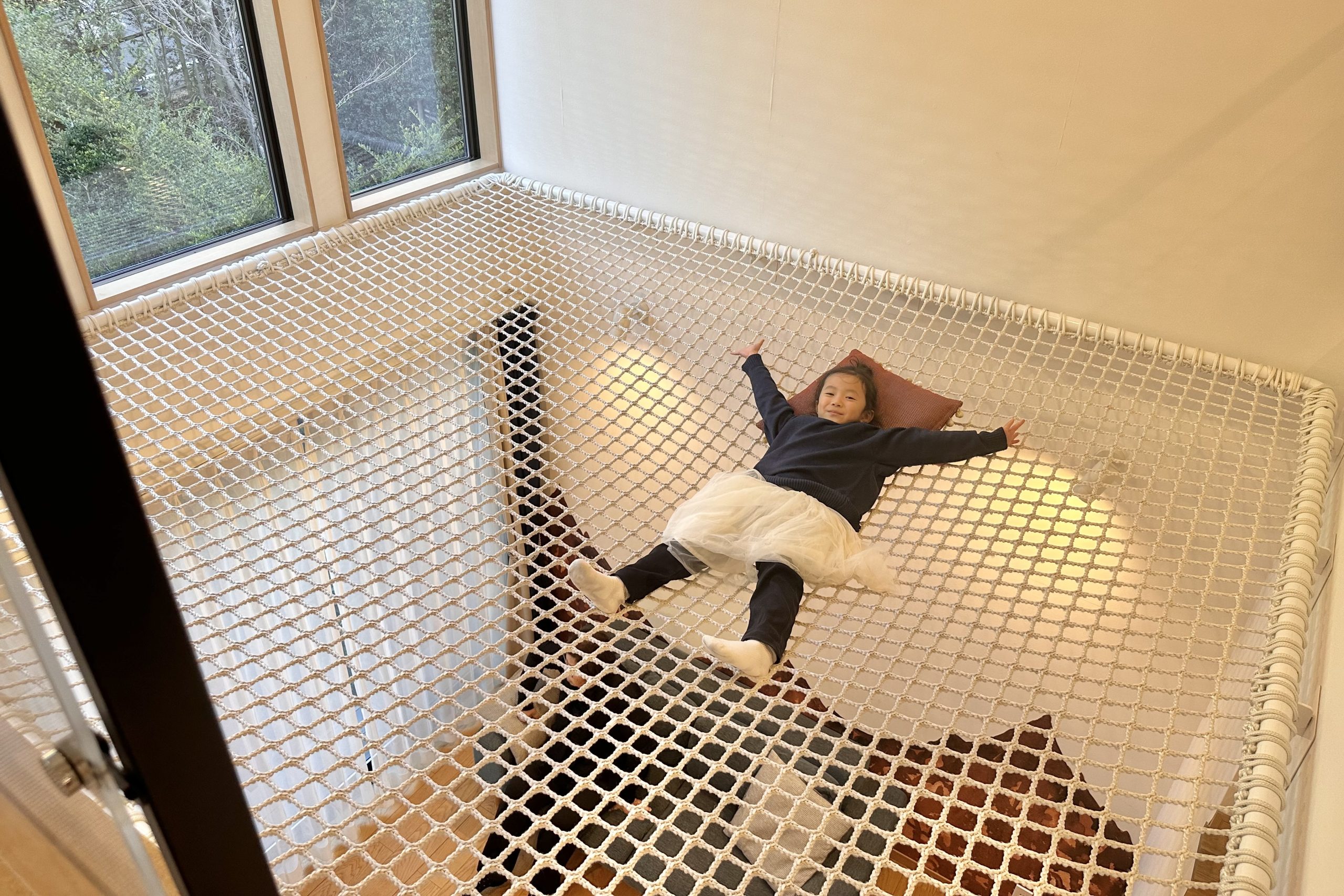 そして真っ先に駆け上がったのが2階にある「空中ネット」でした。ハンモックのようなネットスペースは、跳ねたり寝転んだりと自由に遊べる秘密基地。