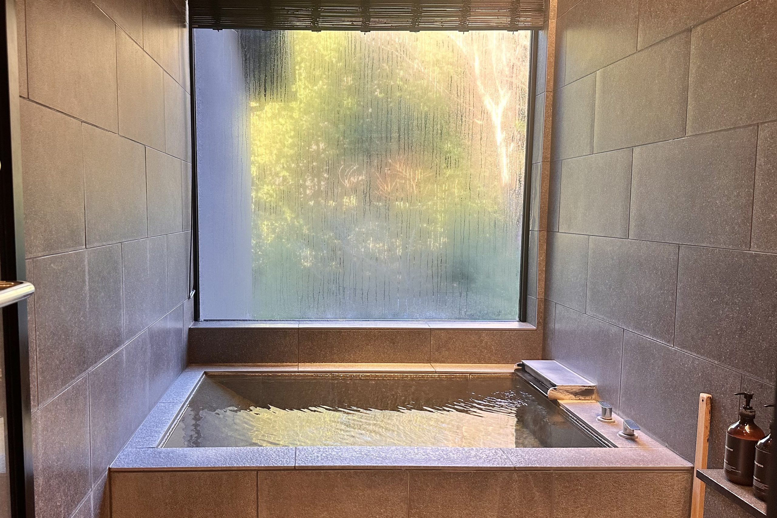 そして客室には好きなときに時間を気にせずに入れる掛け流しの天然温泉があります。夜だけでなく、ゆっくりと朝風呂も楽しみました。
