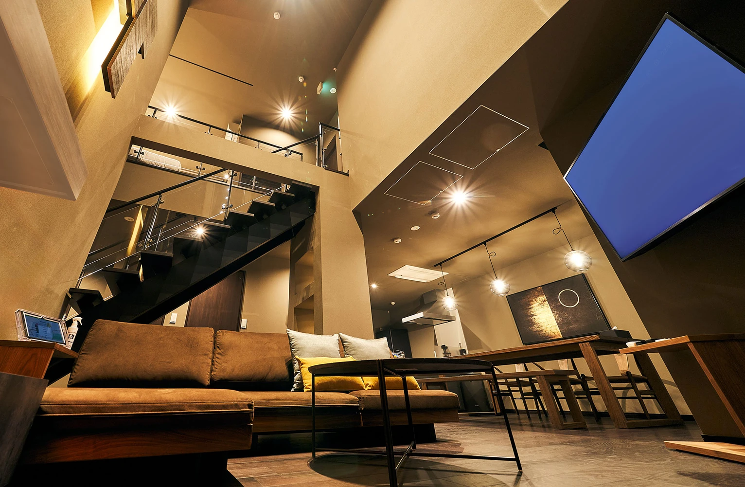 吹き抜けのリビング、ダイニング、キッチンを中心としたメゾネットタイプで最大10名まで宿泊可能。全室天然温泉付きという贅沢な滞在が叶います。