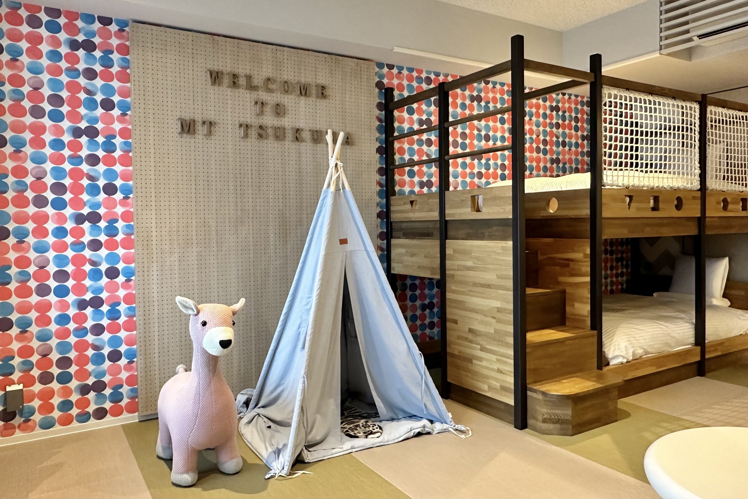二段ベッドのあるメインルームには、ティピーテントや家族でくつろげるソファセットがあり、子どもたちが思いっきり遊んでいる間、大人はゆったりとくつろぐことも。