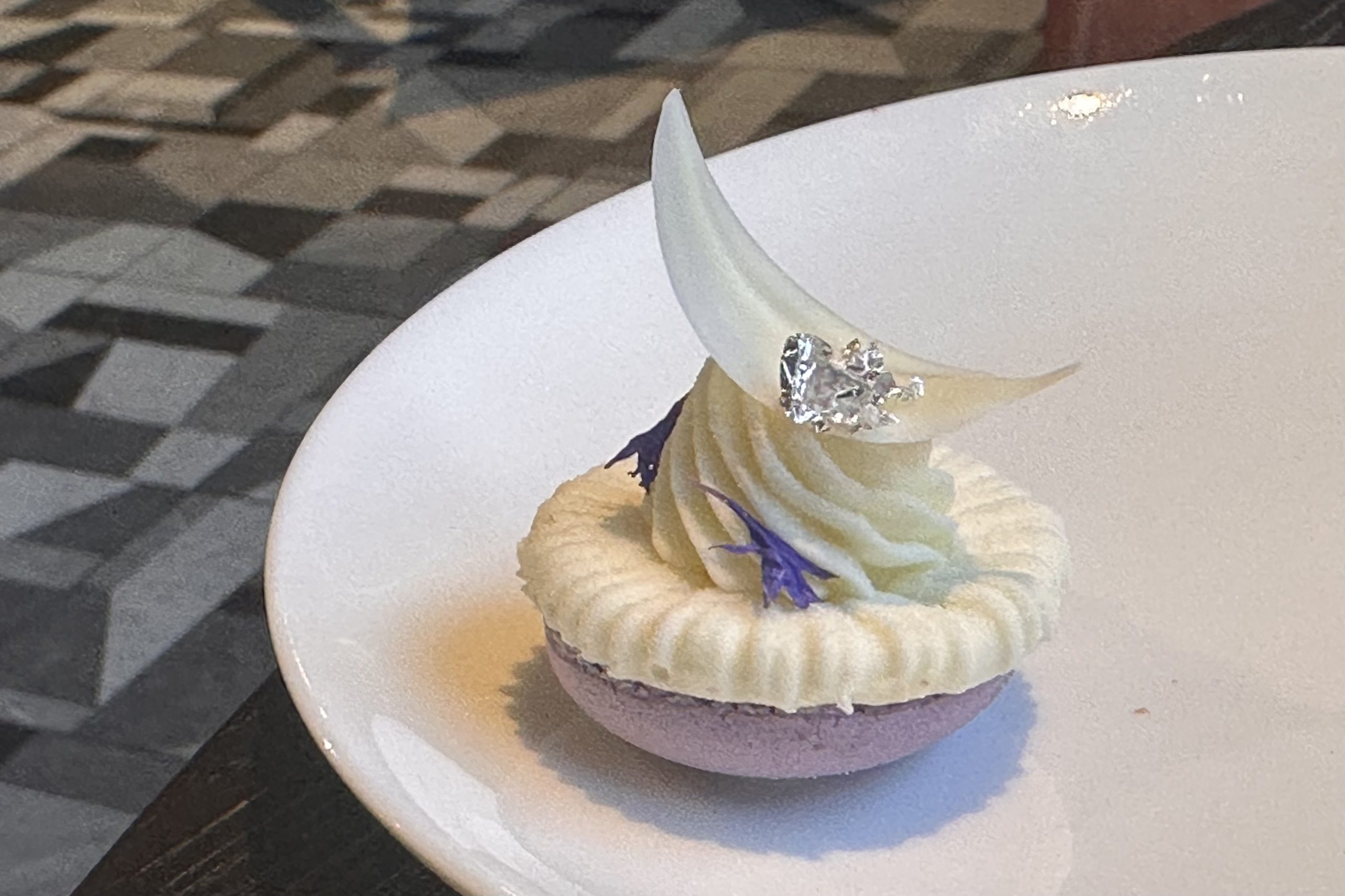 一番手前には、「スミレとホワイトチョコレートのムース」。バレリーナのチュチュを表現した美しいホワイトチョコのムース。下にはマカロンが敷かれ、食感のコントラストも楽しめます。