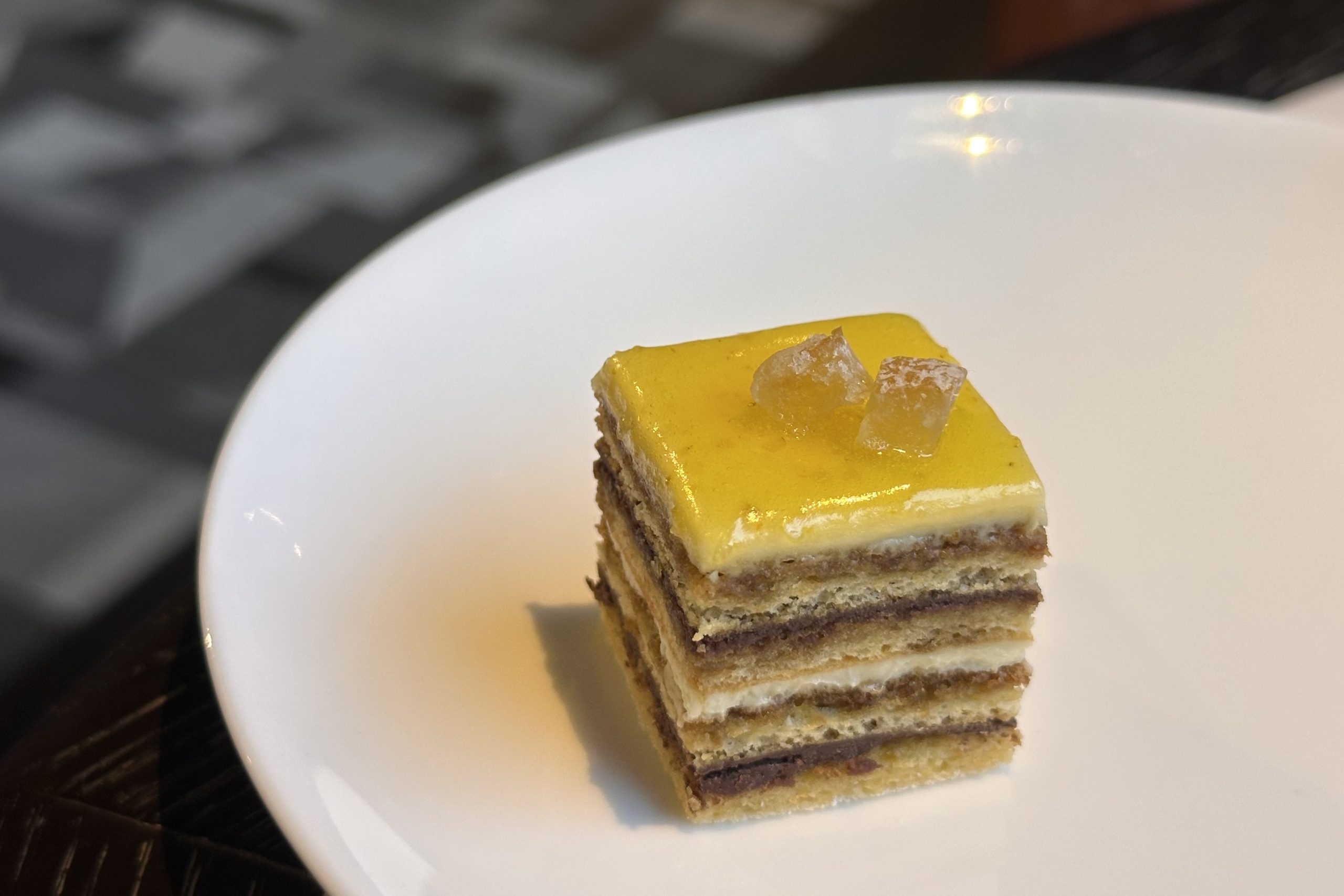 フジコの黄色い洋服をイメージした黄色のスイーツは、「エスプレッソと柚子のガトーオペラ」。パリ・オペラ座に由来するフランス菓子で、エスプレッソと柚子の香りが重なる大人の味わいです。
