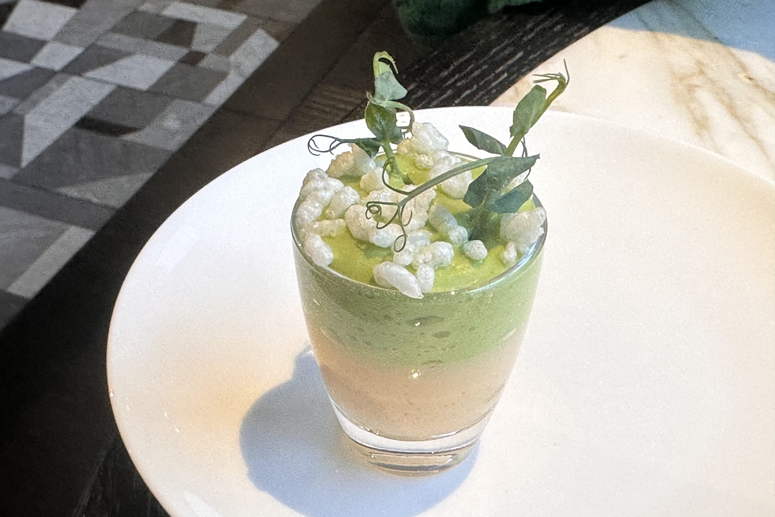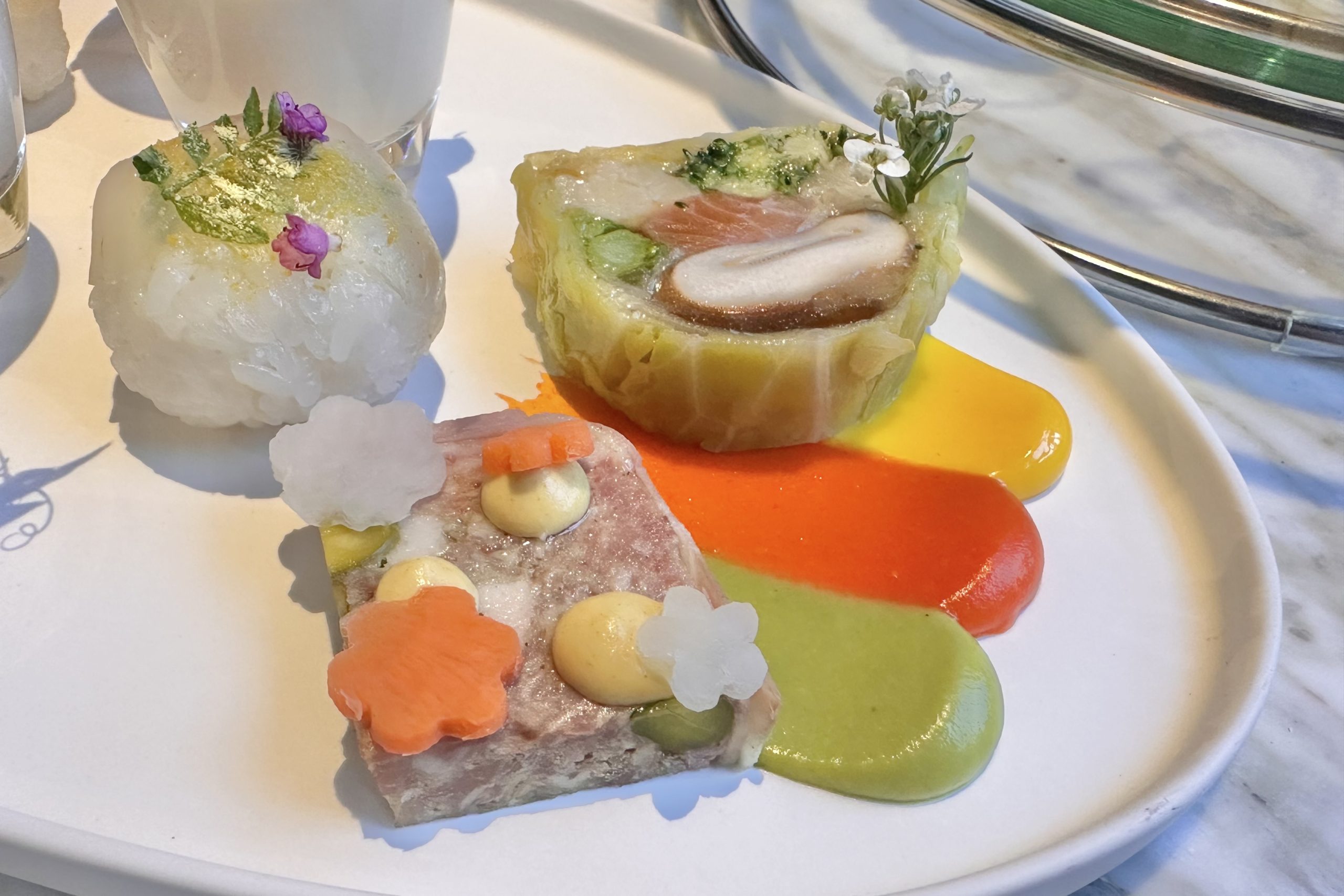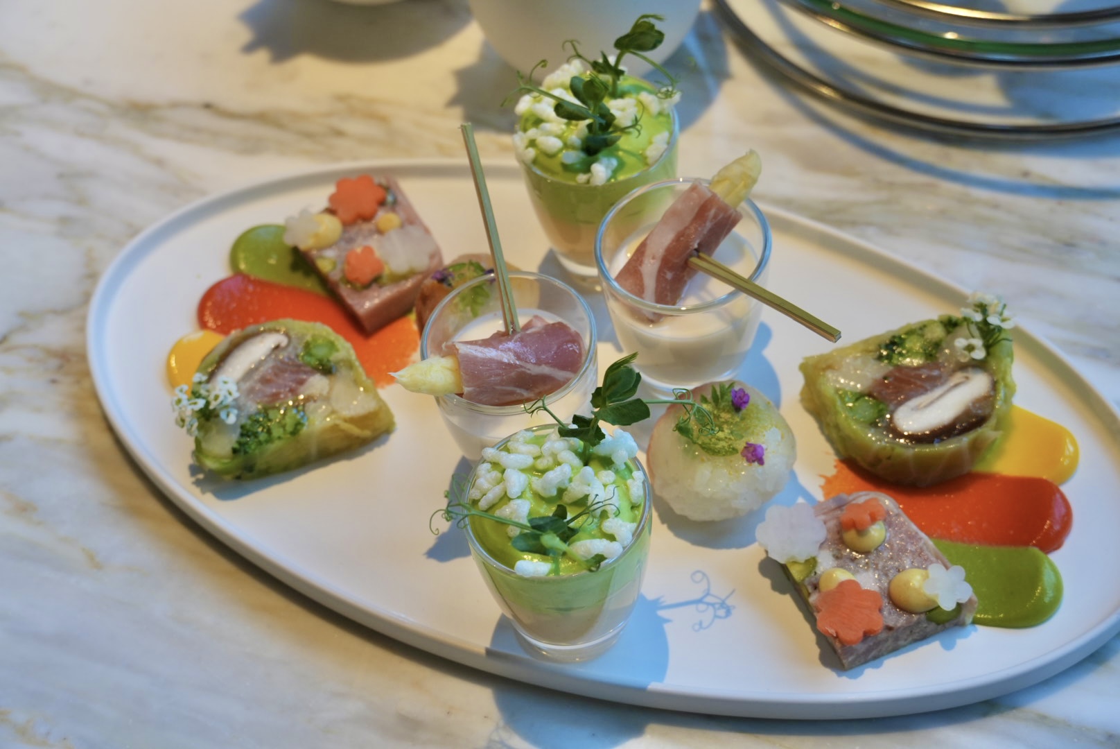 優しい味わいの「ホワイトアスパラのブランマンジェ 生ハムの小さなブロシェット」。さらに「和風だしの冷製茶碗蒸し ロワイヤル仕立て」や「鯛と木の芽の手毬寿司」など和の要素も取り入れられているのも印象的。