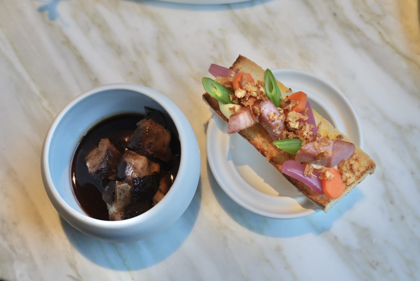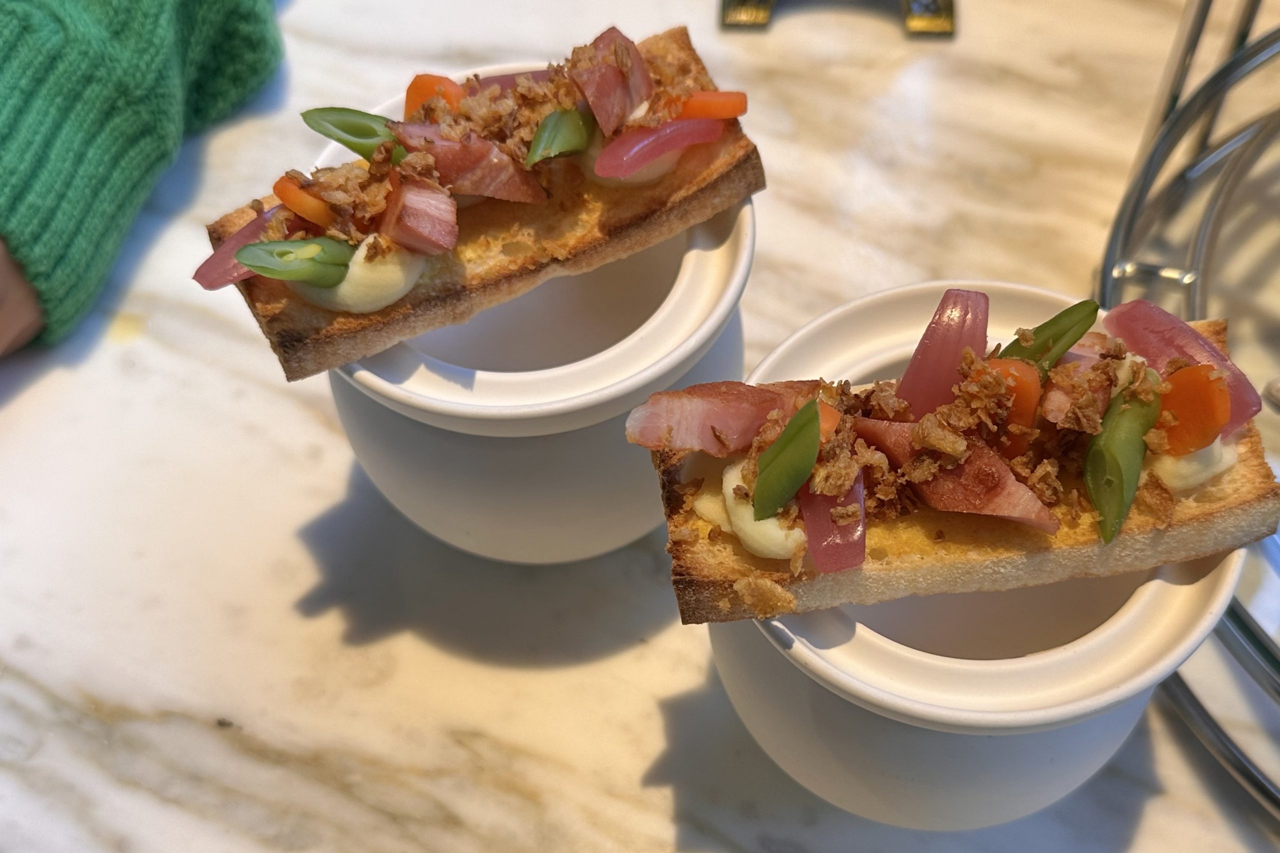 そして、プレートとは別に「鶏肉の赤ワイン煮込み 小野菜とベーコンのタルティーヌ添え」が、提供されます。メルキュール東京日比谷のアフタヌーンティー初となる温かいセイボリー。